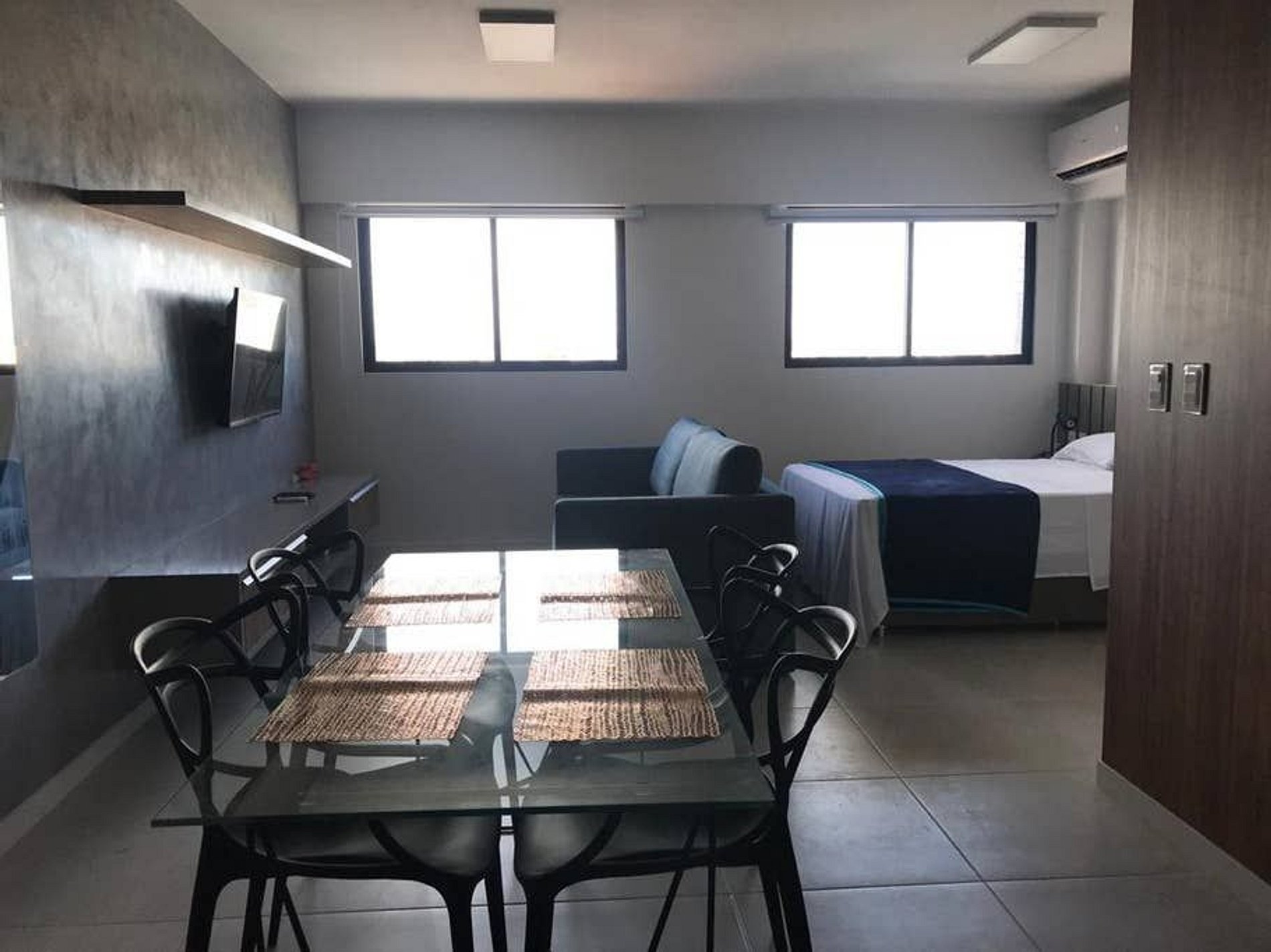 O apartamento tipo studio comporta até 4 pessoas, duas na cama de casal e duas no sofá-cama. Tem uma cozinha totalmente equipada com geladeira, microondas, fogão com forno, liquidificador, cafeteira, sanduicheira, pratos, panelas, talheres e demais utensílios de cozinha para você preparar suas refeições com comodidade. Conta ainda com chuveiro elétrico, wi-fi e tv.