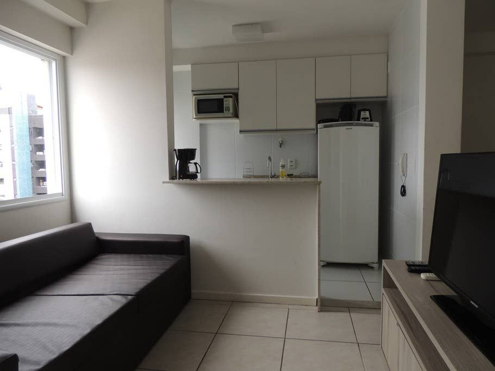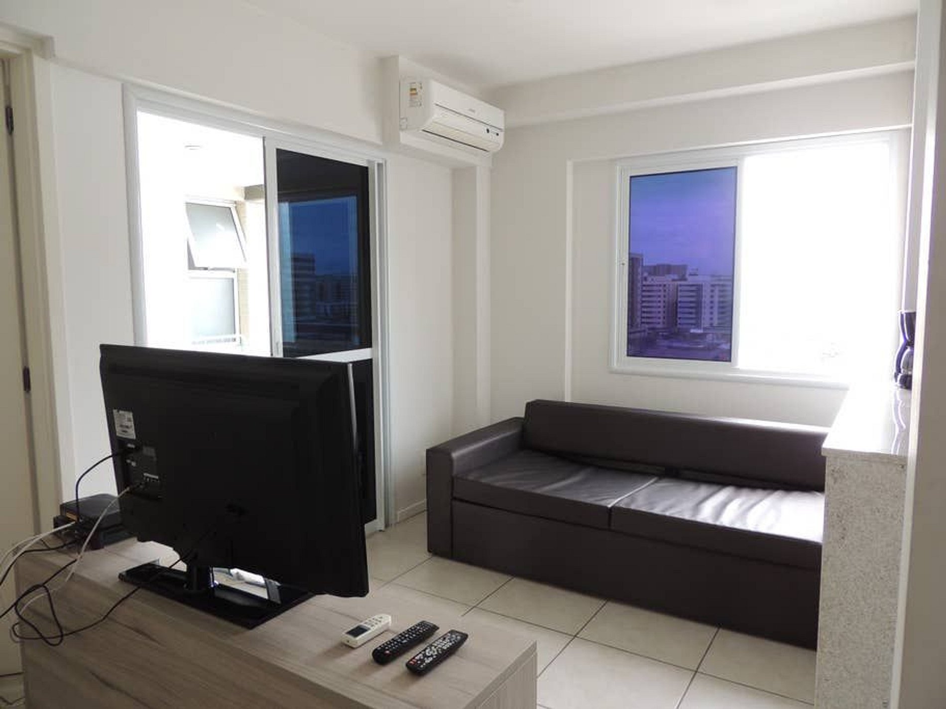 Apartamento com uma suíte, sala com sofá-cama, cozinha americana equipada e varanda. Totalmente nascente e climatizado.
