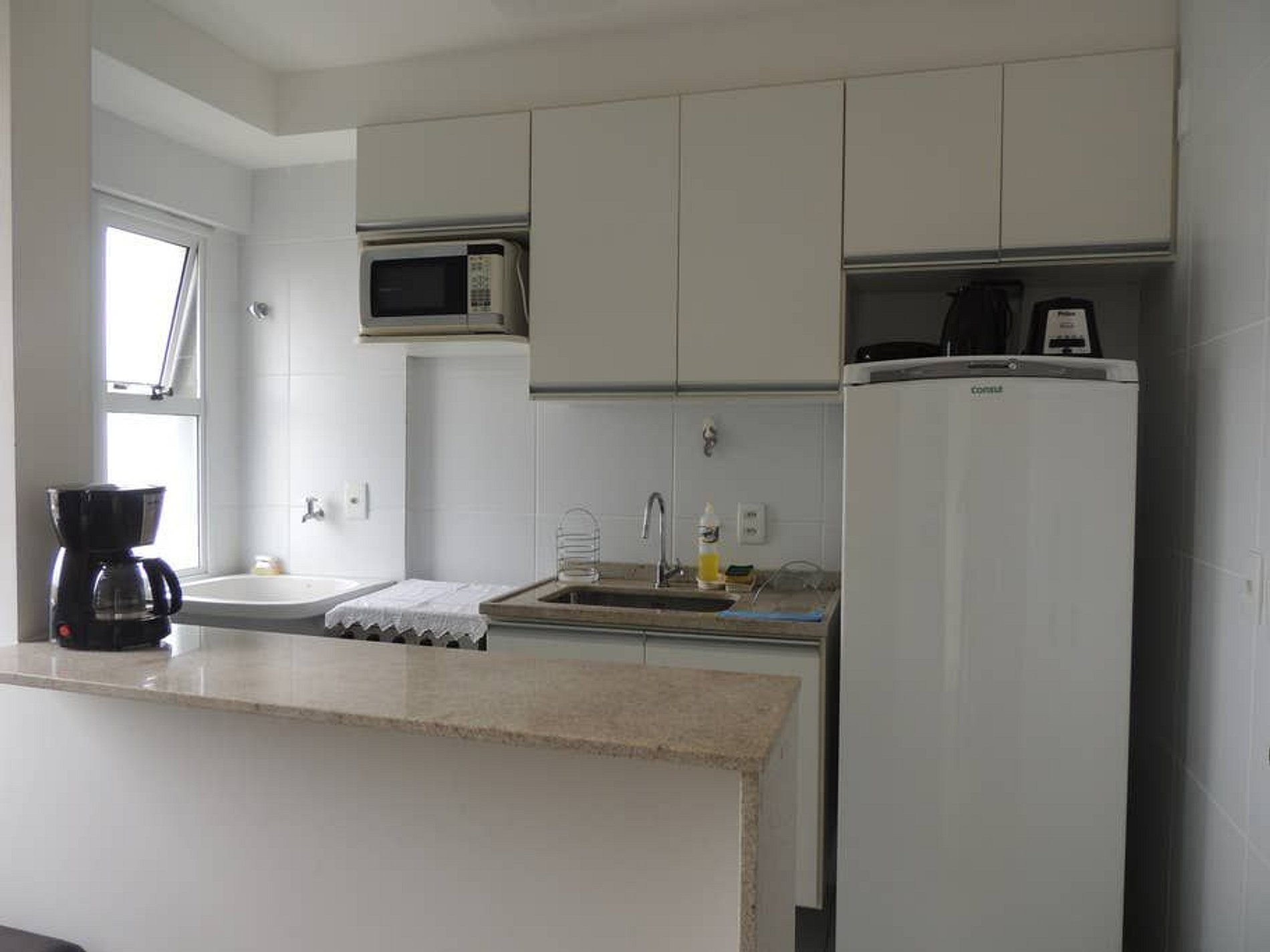 . - Cozinha americana totalmente equipada como fogão, geladeira, microondas, cafeteira, liquidificador, sanduicheria, pratos, copos, talheres e panelas para que você possa fazer suas refeições com tranquilidade. O apartamento também possui máquina de lavar roupa.