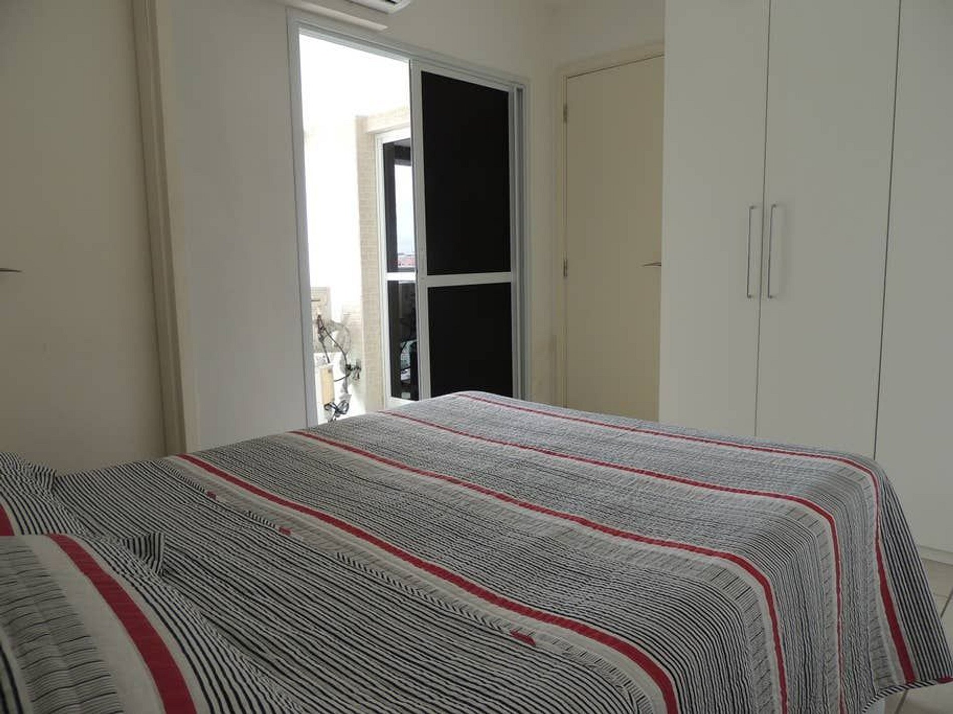 - O apartamento de 40m2 com um quarto com cama de casal, guarda-roupa, ar condicionado split, roupas de cama e de banho, banheiro com chuveiro elétrico.